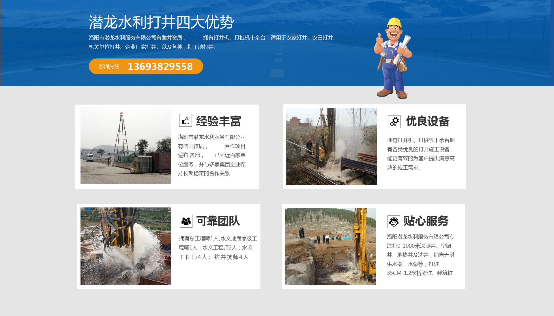 洛陽市潛龍水利服務(wù)有限公司成立于2009年,注冊資金200萬元,擁有河南省水井供水技術(shù)協(xié)會頒發(fā)的河南省水井施工單位壹級資質(zhì)證書,公司擁有打井機(jī)、打樁機(jī)十余臺;適用于農(nóng)家打井、農(nóng)田打井、機(jī)關(guān)單位打井、企業(yè)廠家打井、以及各種工程工地打井。洛陽潛龍水利服務(wù)有限公司打0-1000米深淺井、空調(diào)井、地?zé)峋跋淳讳N售無塔供水器、水泵等;打樁35CM-1.2米橋梁樁、建筑樁等;代辦洗井業(yè)務(wù);農(nóng)業(yè)水利灌溉,土地開發(fā)整理項(xiàng)目可行性研究、編制、規(guī)劃、設(shè)計(jì)、預(yù)算編制、標(biāo)書編制、水利技術(shù)咨詢服務(wù)。
